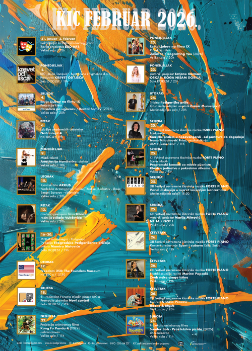 Filmski program biće u znaku svečane premijere filma „Obraz” reditelja Nikole Vukčevića, koji će nakon uspješnog festivalskog života obilježenog sa više od 25 međunarodnih selekcija, dvadesetak osvojenih nagrada, te nacionalne kandidature za nagradu Oskar, 13. februara biti prikazan u digitalizovanoj bioskopskoj sali KIC-a. Deveta u nizu revija „Ljubav na filmu” donijeće filmska ostvarenja koja na različite načine propituju složenost međuljudskih odnosa, a među njima su „Porodica po ugovoru/Rental Family” (2025) i „Žalim te/Regretting You” (2025). Na repertoaru će biti i sinhronizovani animirani filmovi „Kung Fu Panda 4” (2024) i „Sunđer Bob – Prokletstvo pirata” (2025). Publika će biti u prilici od 16. do 20. februara da pogleda i televizijski serijal „Titogradske Podgoričanke pričaju” autora Momira Matovića.