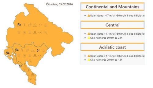 Zavod za hidrometeorologiju i seizmologiju Crne Gore izdao je za danas i sjutra narandžasti meteoalarm za cijelu državu zbog najavljenih jakih udara vjetra i obilnih padavina.