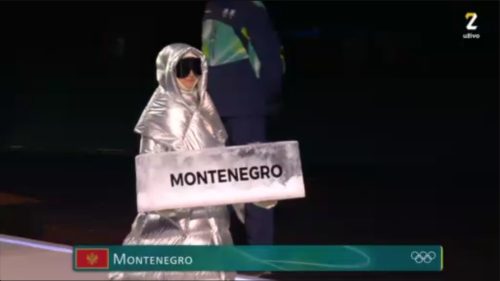 Crnogorsku zastavu nosio je Branislav Peković koji će se takmičiti u alpskom skijanju, osim njega Crnu Goru će predstavljati Aleksandar Grbović u nordijskom skijanju.