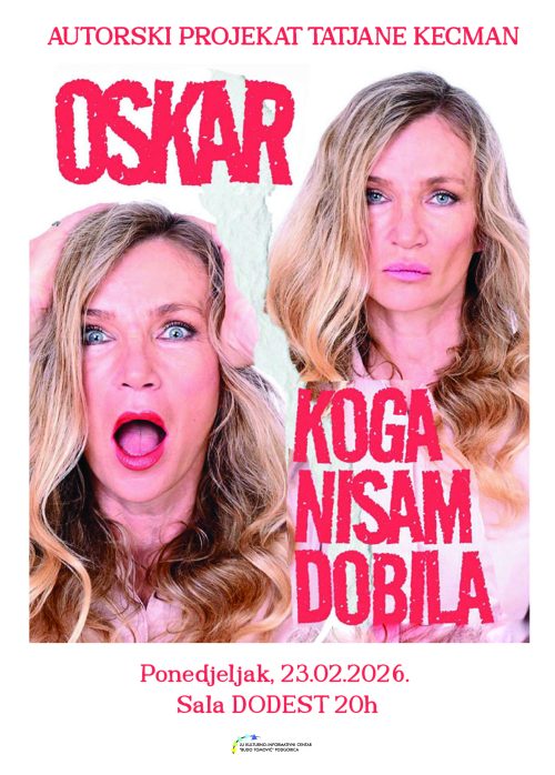 Nova monodrama „Oskar, koga nisam dobila” glumice Tatjane Kecman koja neposredno i sa mnogo humora govori o svijetu savremene glume iza kulisa, biće izvedena u ponedjeljak, 23. februara, u sali DODEST, od 20 sati, saopšteno je iz PR službe KIC-a ,,Budo Tomović”.