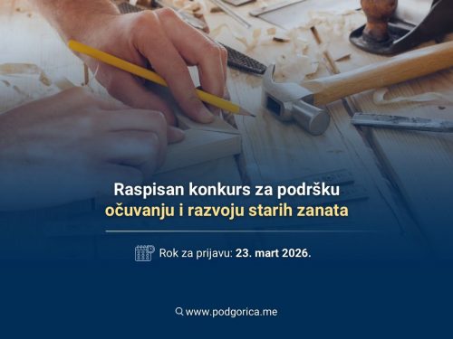– Pozivaju se zanatlije koje se bave starim zanatima sa prebivalištem, odnosno sjedištem na teritoriji Podgorice, da dostave svoje prijave na Konkurs za raspodjelu sredstava iz Budžeta namijenjenih zanatlijama koji žele da pokrenu ili razvijaju sopstveno poslovanje. Glavni grad opredjeljuje 60.000,00€ za prvi Konkurs za raspodjelu sredstava iz Budžeta Glavnog grada – Podgorica opredijeljenih za podršku starim zanatima u 2026. godini. Maksimalan iznos dodijeljenih sredstava po biznis planu ne može iznositi više od 50% od ukupnog iznosa predviđenog za predmetni konkurs. Sredstva predviđena Budžetom Glavnog grada za 2026. godinu raspodjeljuju se za biznis ideje koje doprinose afirmaciji i valorizaciji kulturnog potencijala i tradicije Podgorice, podizanju nivoa urbane kulture i očuvanju kulturne baštine kao i stručnom osposobljavanju lica i zapošljavanju novih lica – navodi se u saopštenju Sekretarijata za preduzetništvo i investicije Glavnog grada.