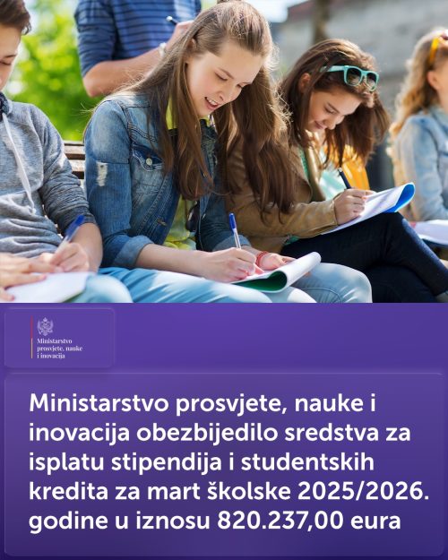 Obezbijeđena su ukupna sredstva za isplatu stipendija i studentskih kredita za mart školske 2025/2026. godine u iznosu 820.237 eura, saopšteno je iz PR službe Ministarstva prosvjete, nauke i inovacija Crne Gore.