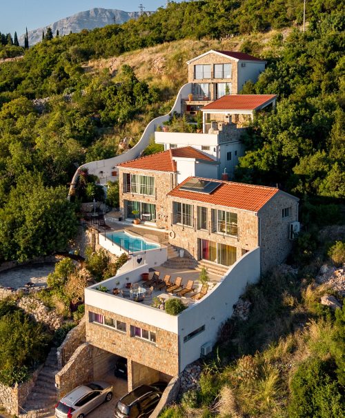 Na Luštici, među maslinama i kamenim guvnima, izrasla je Vila Diva – kuća koja je od samog početka bila koncept, a ne samo arhitektura. Zidovi čuvaju tragove prošlosti: bioskopske stolice iz napuštenog kina u Oksfordu, improvizovane instalacije volontera, stare jugoslovenske novčanice. Svaka soba nosi svoj karakter – od „honeymoon suite“ sa kosim krevetom i kadom u sredini sobe, do Nautičke sobe sa kapama britanske mornarice i  đedovog starog radnog stola pretvorenog u trpezarijski sto.