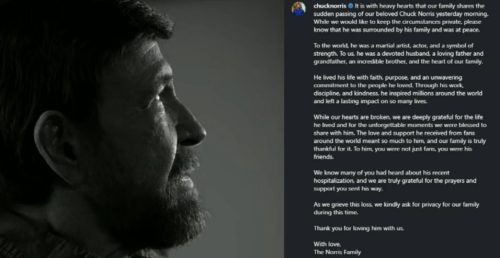– Sa teškim srcem dijelimo vijest o iznenadnom odlasku našeg voljenog Čaka Norisa juče ujutru. Iako bismo željeli da okolnosti zadržimo privatnim, molimo vas da znate da je bio okružen porodicom i da je bio spokojan. Za svijet, on je bio majstor borilačkih vještina, glumac i simbol snage. Za nas, bio je posvećen suprug, brižan otac i djed, nevjerovatan brat i srce naše porodice.
