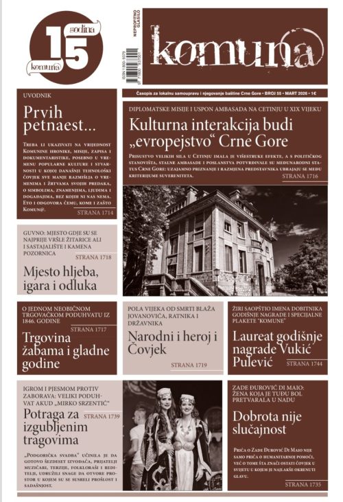 Najnoviji broj Komune počinje Uvodnikom pod naslovom „Prvih petnaest…“mr Željka Rutovića posvećenog 15-to godišnjici časopisa koji otvara dveri prošlosti Crne Gore, ali i podsjeća na ličnosti i vremena koja su obilježila milenijumsko postojanje naše države uz naglasak da Komunino petnaestogodišnje iskustvo govori o kulturološkoj misiji otpora zaboravu, raznih oblika i karaktera čiji simboli blistavih riječi, slobode, baštine, jezika, kulture, etike i tradicije ostaju trajnim govorom o (po)kazivanju naše prošlosti.
