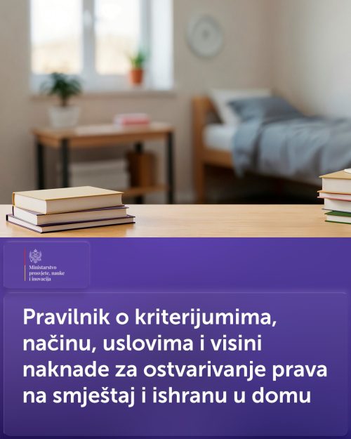 – Podsjetićemo, pravo na besplatan smještaj i ishranu u domovima ima učenik sa posebnim obrazovnim potrebama, učenik RE populacije, student sa invaliditetom i student RE populacije. Dom u okviru smeštajnih kapaciteta namjenski opredjeljuje do 5 posto kapaciteta za smještaj učenika sa posebnim obrazovnim potrebama, učenika RE populacije, učenika bez jednog ili oba roditelja i učenika korisnika materijalnog obezbeđenja u skladu sa zakonom kojim se uređuje socijalna i dječja zaštita. Takođe, dom namjenski opredjeljuje do 7 posto kapaciteta za smještaj studenata sa invaliditetom, studenata RE populacije, studenata bez jednog ili oba roditelja i studenata korisnika materijalnog obezbjeđenja u skladu sa zakonom kojim se uređuje socijalna i dječaka zaštita – zaključuju.
