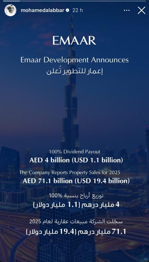 Prema objavi koju je na društvenoj mreži Instagram objavio osnivač Emaar-a Mohamed Alabbar, kompanija planira isplatu dividende u iznosu od četiri milijarde dirhama (oko 1,1 milijardu dolara), što predstavlja stopu isplate od čak 100 posto.