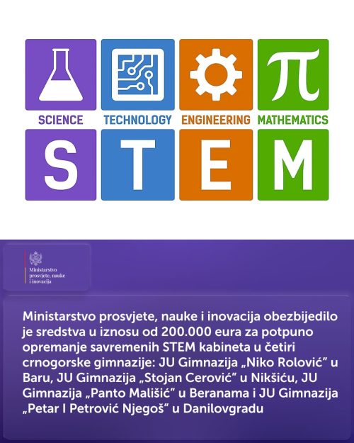 Ministarstvo prosvjete, nauke i inovacija obezbijedilo je sredstva u iznosu od 200.000 eura za potpuno opremanje savremenih STEM kabineta u četiri crnogorske gimnazije: JU Gimnazija „Niko Rolović” u Baru, JU Gimnazija „Stojan Cerović” u Nikšiću, JU Gimnazija „Panto Mališić” u Beranama i JU Gimnazija „Petar I Petrović Njegoš”u Danilovgradu.