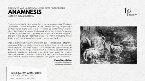 Izložba fotografija „Anamnesis“ autorke Olge Žolobove, održaće se u srijedu, 29. aprila 2026. godine, sa početkom u 19 časova, u Fotografskoj galeriji F64 (Ul. Đoka Miraševića 61, Podgorica).